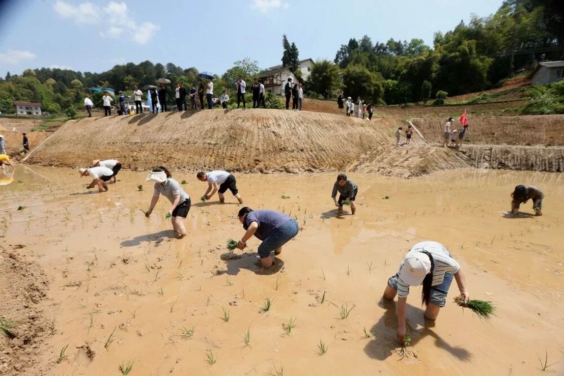 ▲游客们来到鱼池村体验插秧。(资料图片)特约摄影钟志兵
