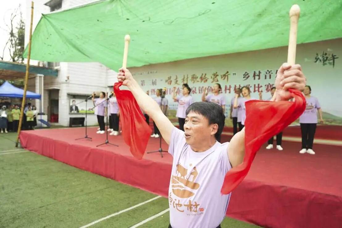 ▲鱼池村村民唱响村歌《云上鱼池》。(资料图片)记者谢智强摄